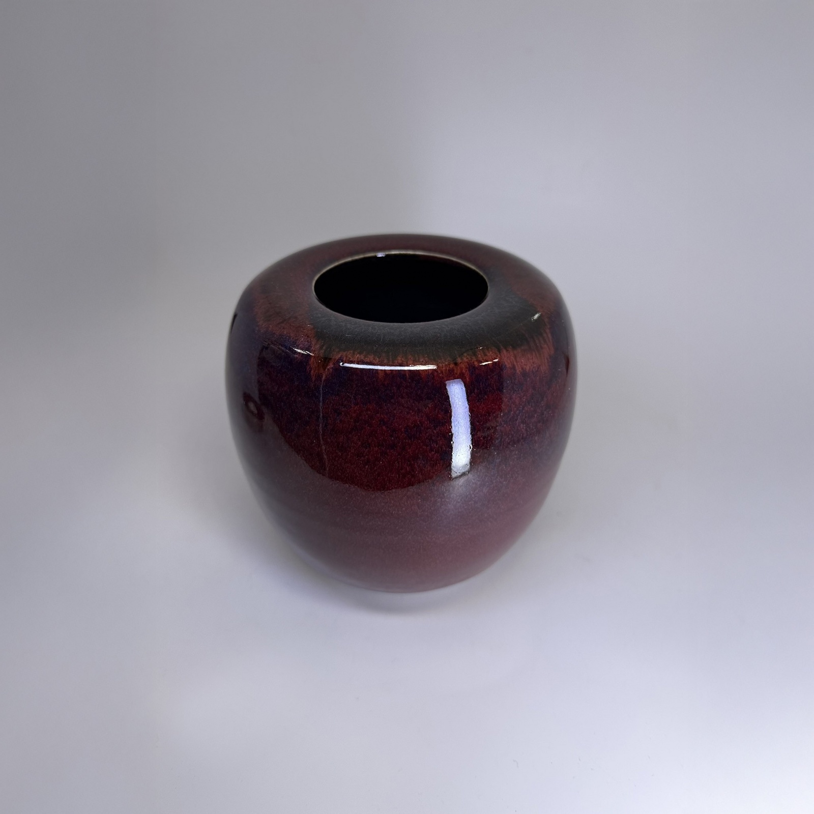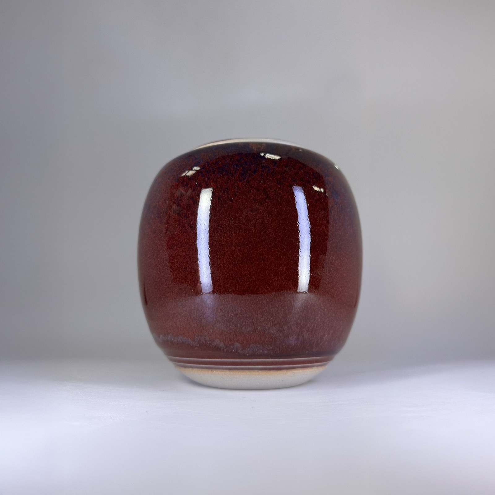 ‘Garnet’ is a hand-thrown stoneware urn, finished in a traditional Chinese ox-blood glaze that pools into a deep, dark burgundy red. The matching ceramic lid reveals soft touches of tenmoku layered beneath the surface, adding richness and quiet movement to the piece.